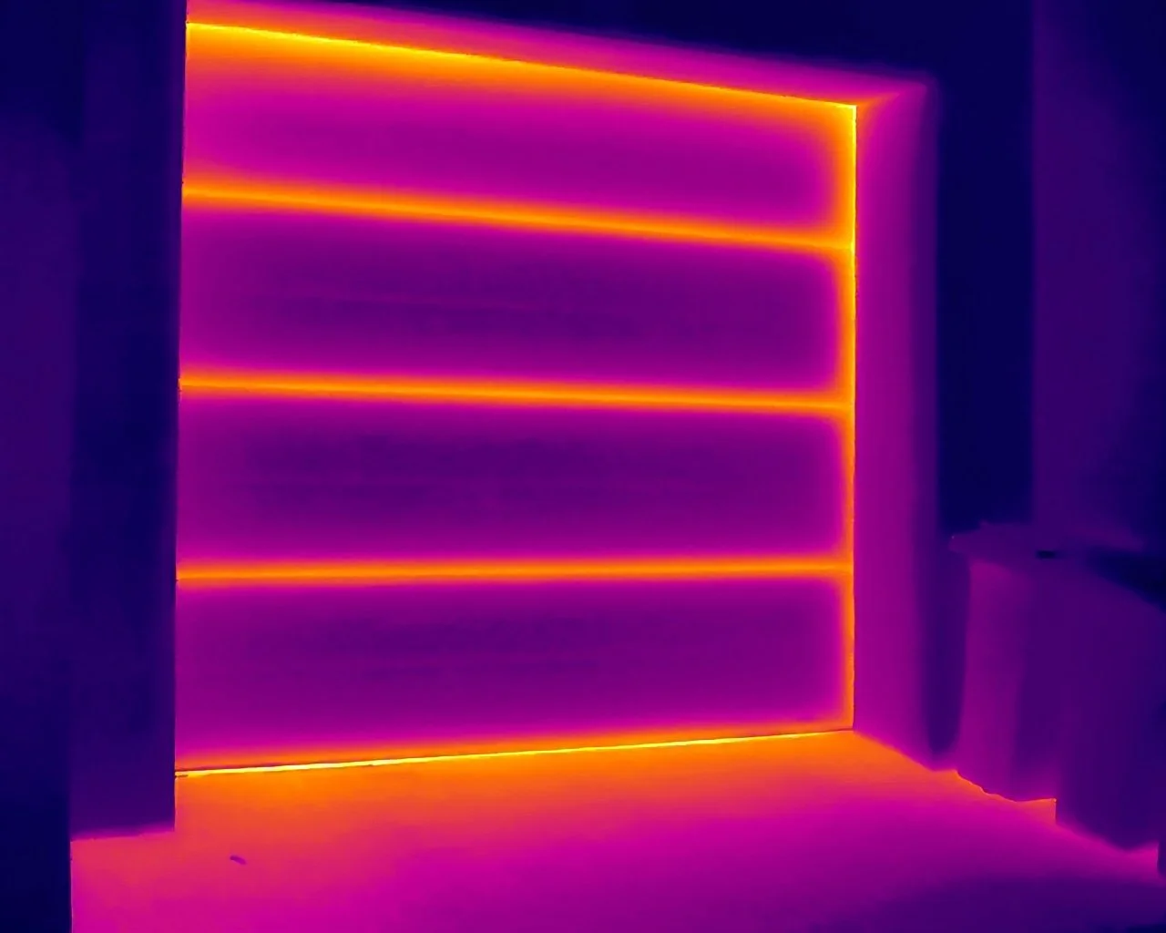 A garázskapu szintén „világít” a képen – a panelek illesztéseinél hőhidak keletkeztek.